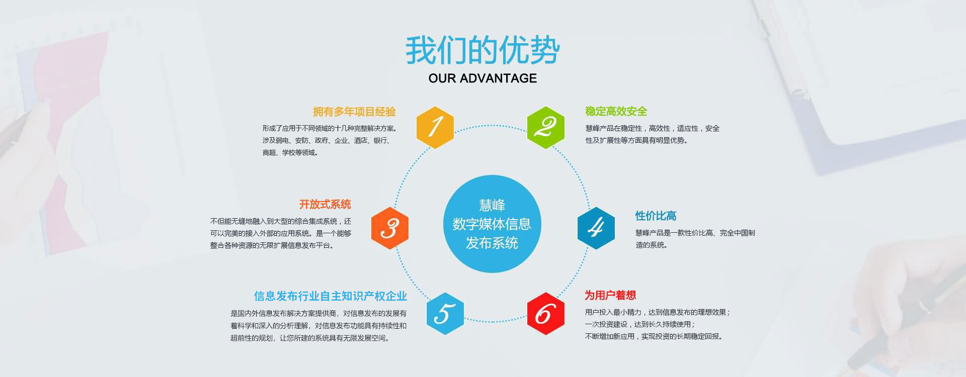 公司本著互惠互利,誠實(shí)信用的原則,真誠面對用戶,并愿與社會(huì)各界展開廣泛的合作。 公司現(xiàn)已是國內(nèi)的數(shù)字媒體信息發(fā)布系統(tǒng)解決方案提供商,產(chǎn)品涉及大中型企業(yè)、商業(yè)地產(chǎn)、各級黨政機(jī)關(guān)、軍隊(duì)、司法、信息通信、金融、醫(yī)療、教育、能源交通、公用事業(yè)領(lǐng)域。